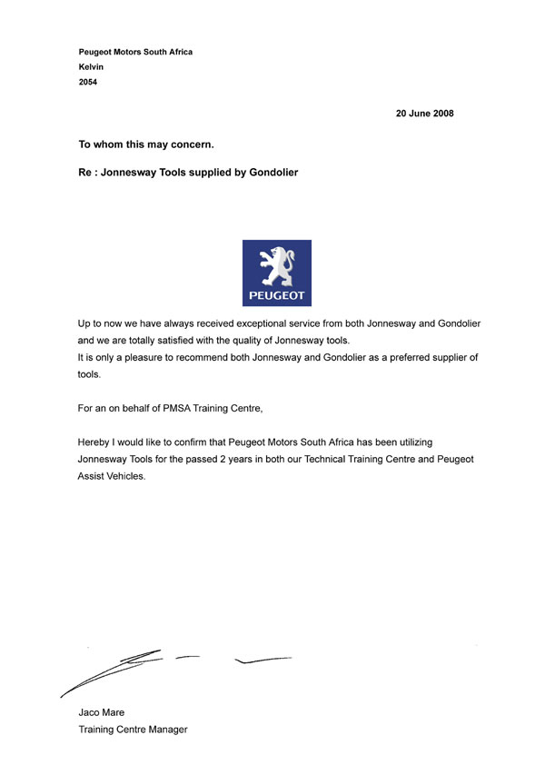 Концерн PSA подтверждает использование инструмента JONNESWAYв течении 2-х лет в техцентрах и службе поддержки автомобилей PEUGEOT и CITROЁN. Выражает благодарность и удовлетворение сотрудничеством и рекомендует JONNESWAYкак поставщика качественного инструмента.