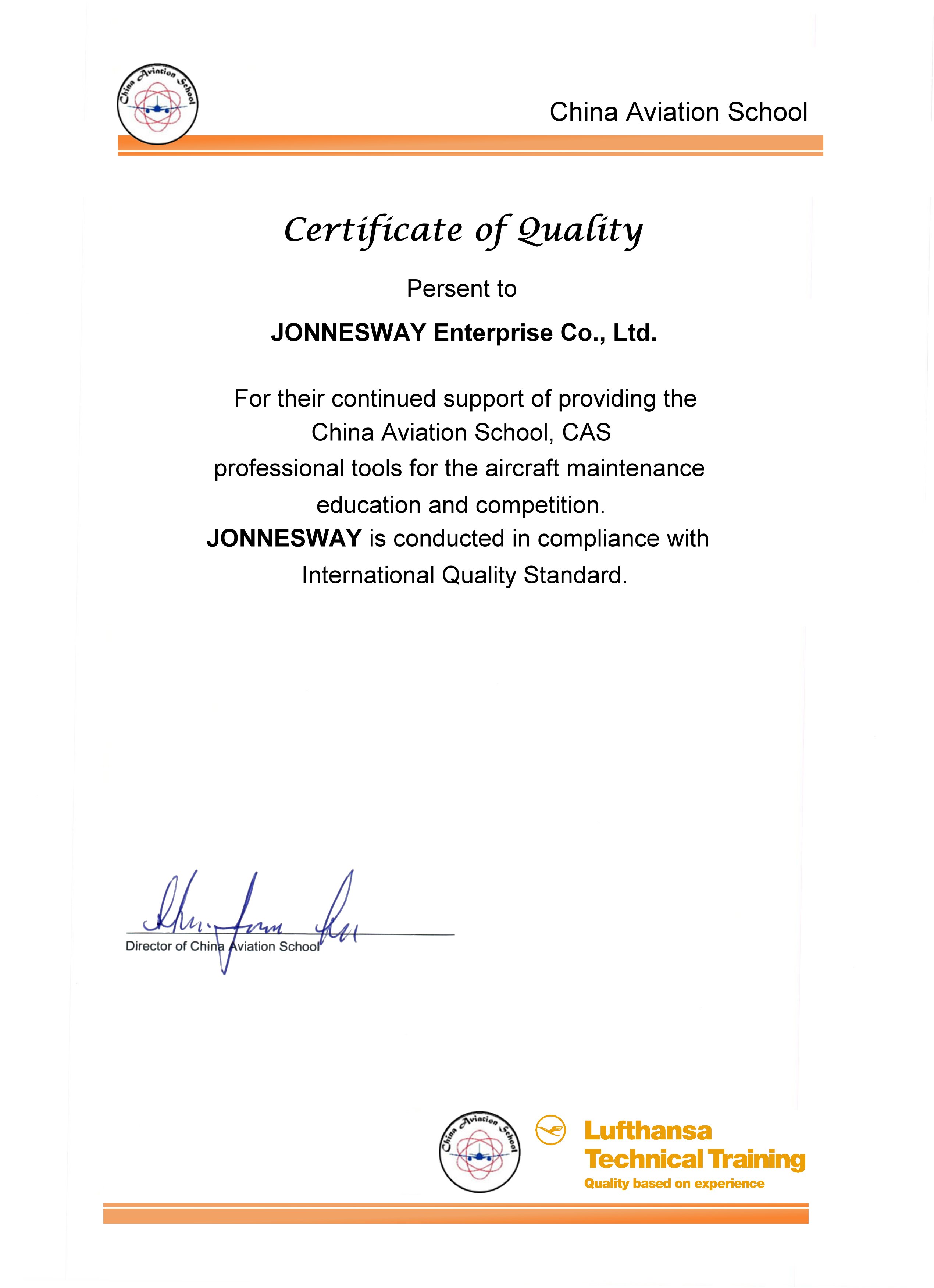 Профессиональные инструменты Jonnesway были выбраны в качестве стандартных инструментов для программы обучения по ремонту и обслуживанию самолетов в CAS, официальном учебном центре авиакомпании Lufthansa в Азии, а также для Национальных Аэромеханических Профессиональных Соревнований. Это большая честь и награда за нашу непрерывную работу и упорство в достижении безупречного качества продукции.