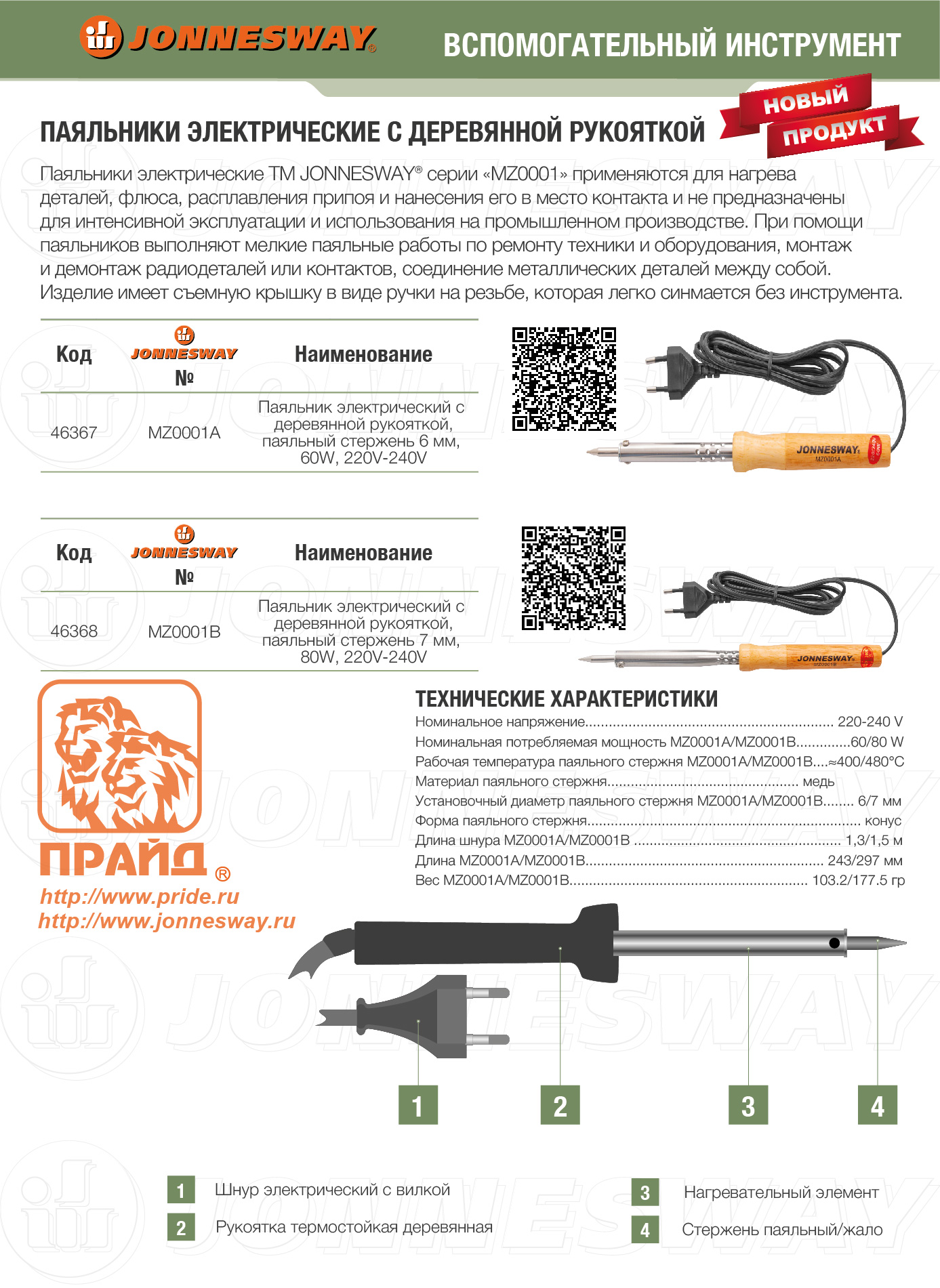 Паяльники электрические Jonnesway серии «MZ0001» применяются для нагрева деталей, флюса, расплавления припоя и нанесения его в место контакта и не предназначены для интенсивной эксплуатации и использования на промышленном производстве. При помощи паяльников выполняют мелкие паяльные работы по ремонту техники и оборудования, монтаж и демонтаж радиодеталей или контактов, соединение металлических деталей между собой. Изделие имеет съемную крышку в виде ручки на резьбе, которая легко снимается без инструмента.