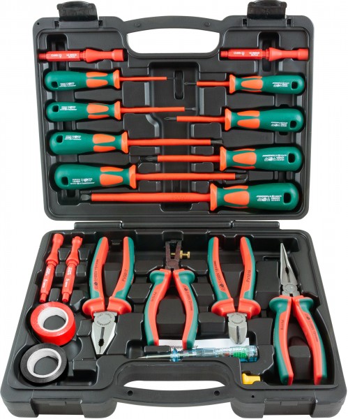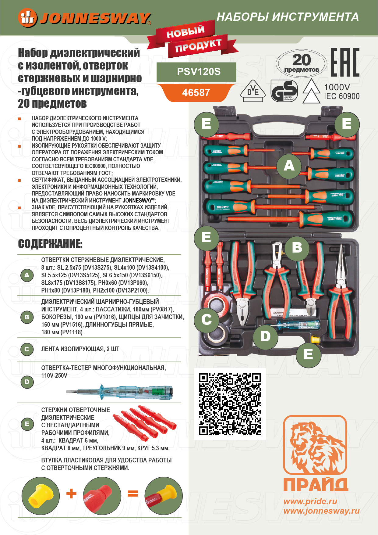 PSV120S Набор диэлектрический с изолентой, отверток стержневых и шарнирно-губцевого инструмента, 20 предметов, код товара: 46587, артикул: PSV120S