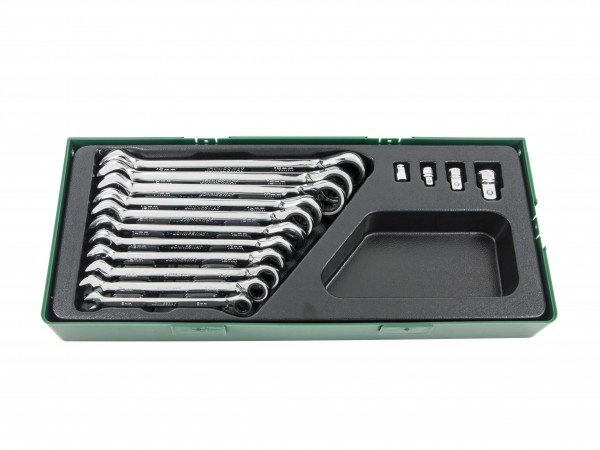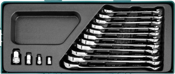 Набор ключей гаечных комбинированных трещоточных с аксессуарами на держателе, 8-19 мм в ложементе 420х180 мм, 15 предметов.