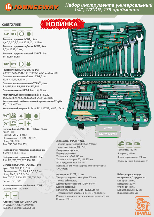 S04H524179S Набор инструмента универсальный 1/4", 1/2"DR, 179 предметов, код товара: 46757, артикул: S04H524179S