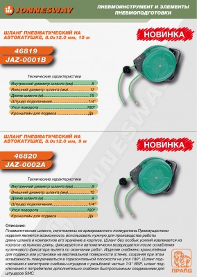 JAZ-0001B Шланг пневматический на автокатушке 8.0х12.0 мм, 15 м, код товара: 46819, артикул: JAZ-0001B