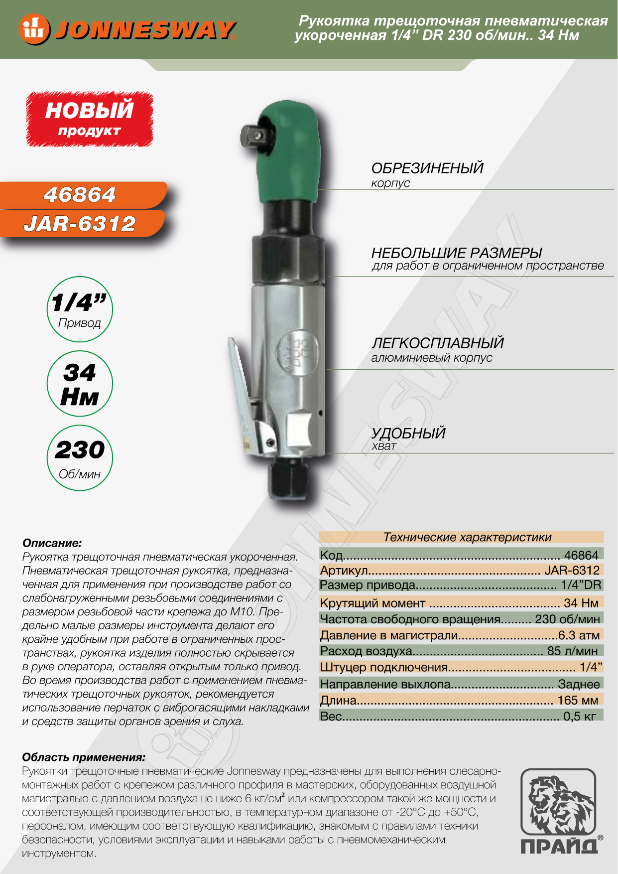 JAR-6312 Рукоятка трещоточная пневматическая укороченная 1/4"DR 230 об/мин., 34 Нм, код товара: 46864, артикул: JAR-6312