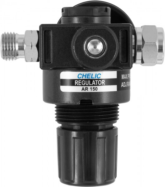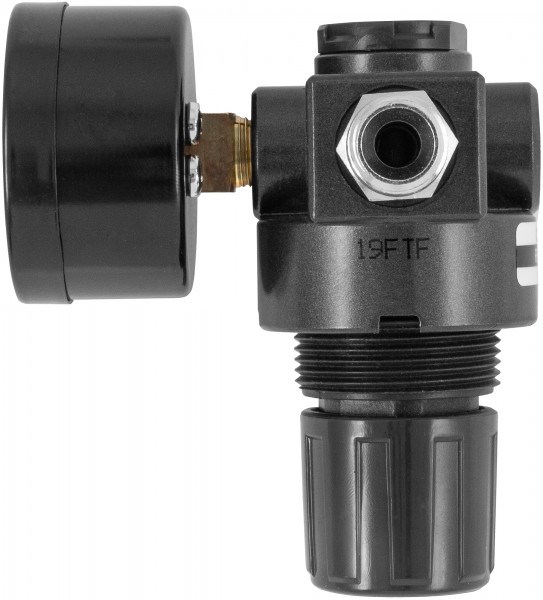 Компактное устройство, применяющееся для контроля и регулировки давления воздуха, поступающего к пневматическому инструменту в диапазоне значений давления от 0 до 10 кгс/см². Регулятор устанавливается непосредственно на рукоятку инструмента с помощью резьбового штуцера.