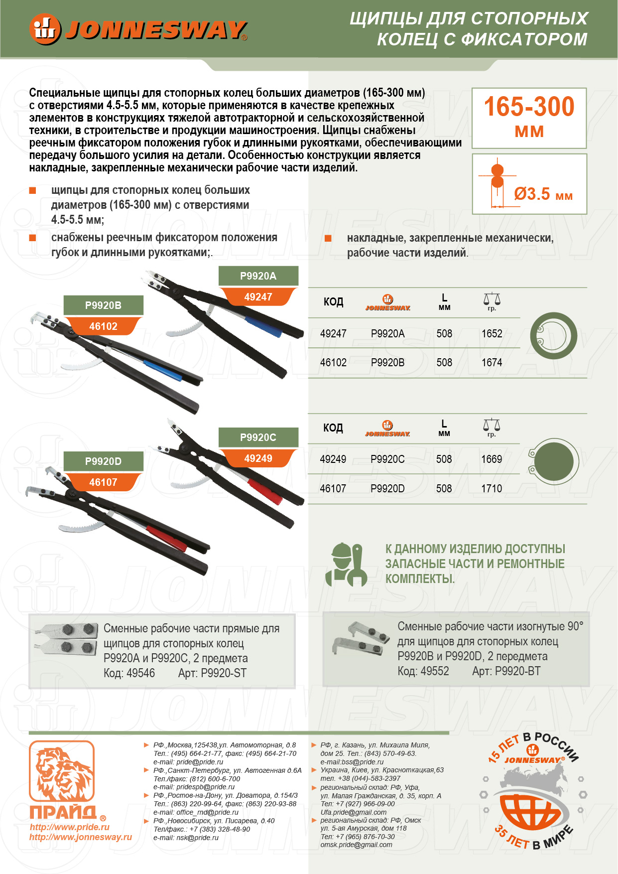 Специальные щипцы для стопорных колец больших диаметров (165-300 мм) с отверстиями 4.5-5.5 мм. серии "Р99" применяются в качестве крепежных элементов в конструкциях тяжелой автотракторной и сельскохозяйственной техники, в строительстве и продукции машиностроения. Щипцы снабжены реечным фиксатором положения губок и длинными рукоятками, обеспечивающими передачу большого усилия на детали. Особенностью конструкции является накладные, закрепленные механически рабочие части изделий.
