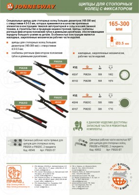 Специальные щипцы для стопорных колец больших диаметров (165-300 мм) с отверстиями 4.5-5.5 мм. серии "Р99" применяются в качестве крепежных элементов в конструкциях тяжелой автотракторной и сельскохозяйственной техники, в строительстве и продукции машиностроения. Щипцы снабжены реечным фиксатором положения губок и длинными рукоятками, обеспечивающими передачу большого усилия на детали. Особенностью конструкции является накладные, закрепленные механически рабочие части изделий.