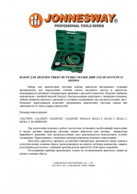 Инструменты и приспособления специального назначения производства компании JONNESWAY® ENTERPRISE CO., LTD., по уровню исполнения относятся к изделиям класса PROFESSIONAL, применяется для производства работ по сборке, ремонту и обслуживания продукции машиностроения, строго персоналом, имеющим соответствующую квалификацию, знакомым с правилами техники безопасности, условиями эксплуатации и навыками работы со специальным инструментом и приспособлениями.