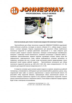 Изделие предназначено для вакуумного отбора отработанных технических жидкостей из картеров двигателей, трансмиссий и т.п. через отверстие щупа контроля уровня жидкости агрегата. Изделие позволяет производить экспресс замену масла без традиционного, гравитационного слива, избегая необходимости установки автомобиля на подъемник, смотровую яму или в случаях, когда конструкция агрегата предусматривает только вакуумный способ замены рабочей жидкости. Приспособление используется для отбора технических жидкостей вязкостью до 2300 мПа*с (SAE 140).