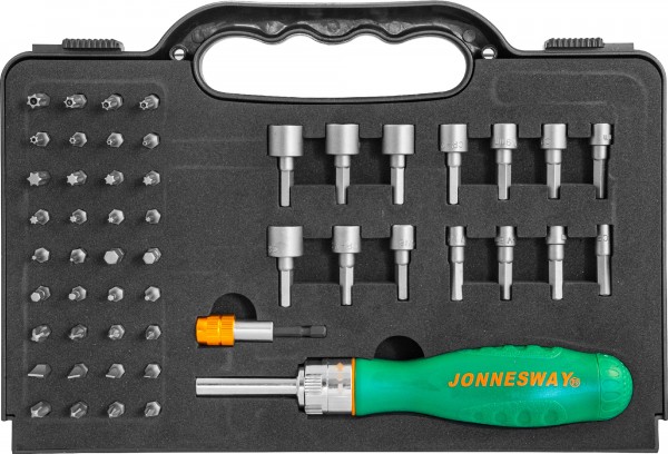 Набор предназначен для работы с резьбовыми соединениями и состоит из отверточной рукоятки с храповым механизмом и наборами бит и торцевых головок.