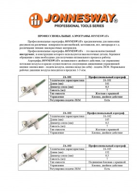 Покрасочные пистолеты и аэрографы компании JONNESWAY® ENTERPRISECO., LTD. по уровню исполнения относятся к изделиям класса PROFESSIONAL, применяются для проведения внутренних и наружных малярно-отделочных работ различными типами лакокрасочных материалов персоналом, имеющим соответствующую квалификацию, знакомым с правилами техники безопасности, условиями эксплуатации и навыками работы.