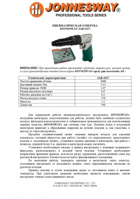 На пневматический механизированный инструмент торговой марки JONNESWAY® распространяется понятие «ограниченной гарантии», в связи с сокращением срока эксплуатации, связанным с повышенным износом некоторых деталей конструкции при использовании. Срок эксплуатации изделия с заявленными характеристиками определен в 12 месяцев с начала использования инструмента. Начало эксплуатации определяется по дате продажи, указанной в гарантийном талоне JONNESWAY® или фискальном документе, подтверждающем факт приобретения конкретного изделия. Срок применения инструмента с объявленными характеристиками может быть изменен индивидуально, как в сторону уменьшения, так и в сторону увеличения в зависимости от интенсивности и условий эксплуатации конкретного изделия (группы изделий).