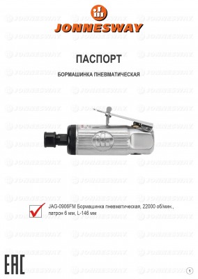 JAG-0906FM Бормашинка пневматическая 22000 об/мин., патрон 6 мм, L-146 мм, код товара: 47773, артикул: JAG-0906FM