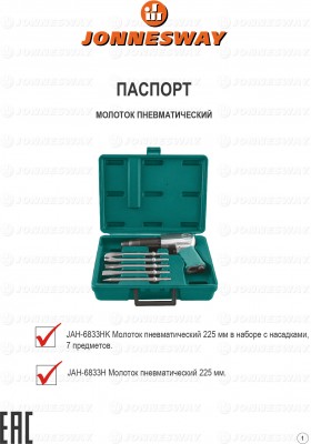 Набор молоток пневматический 2100 уд/мин., патрон H10, с насадками, 8 предметов. Набор, содержащий, помимо собственно пневматического молотка JAH-6833H, пять наиболее распространенных насадок для производства работ по резке, рубке, разрушению и т.п. металов и материалов различной твердости и пластичности. При проведении работ с использованием этого инструмента необходимо защищать руки, с помощью перчаток, гасящих вибрацию, применять средства защиты органов зрения, дыхания и слуха.