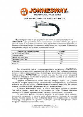 На пневматический механизированный инструмент торговой марки JONNESWAY® распространяется понятие «ограниченной гарантии», в связи с сокращением срока эксплуатации, связанным с повышенным износом некоторых деталей конструкции при использовании. Срок эксплуатации изделия с заявленными характеристиками определен в 12 месяцев с начала использования инструмента. Начало эксплуатации определяется по дате продажи, указанной в гарантийном талоне JONNESWAY® или фискальном документе, подтверждающем факт приобретения конкретного изделия. Срок применения инструмента с объявленными характеристиками может быть изменен индивидуально, как в сторону уменьшения, так и в сторону увеличения в зависимости от интенсивности и условий эксплуатации конкретного изделия (группы изделий).