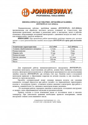Претензии по отношению к инструменту, вышедшему из строя в течение гарантийного срока, принимается к рассмотрению уполномоченным представителем JONNESWAY® ENTERPRISE CO., LTD., в соответствии с Законом «О Защите прав потребителя».