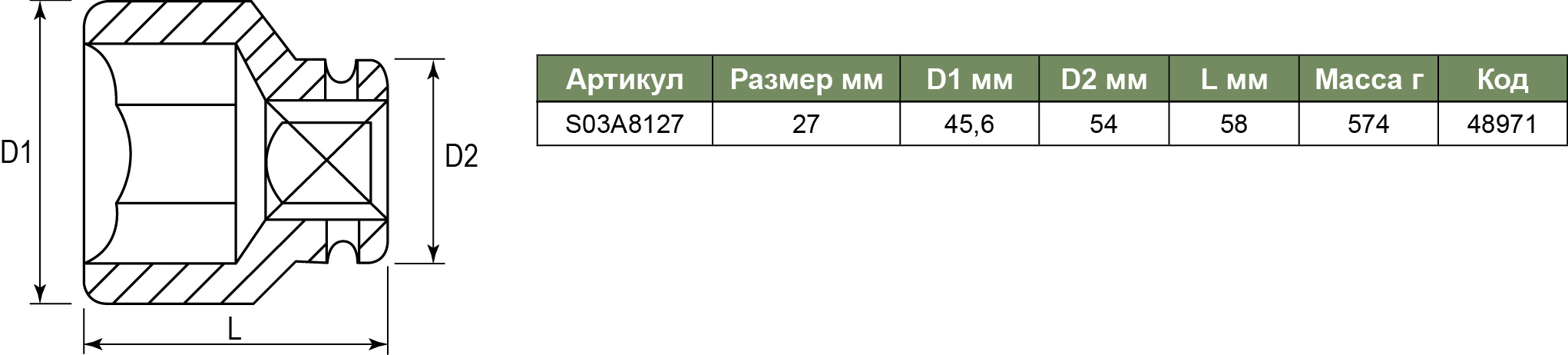 S03A8127 Головка торцевая ударная 1"DR, 27 мм, код товара: 48971, артикул: S03A8127