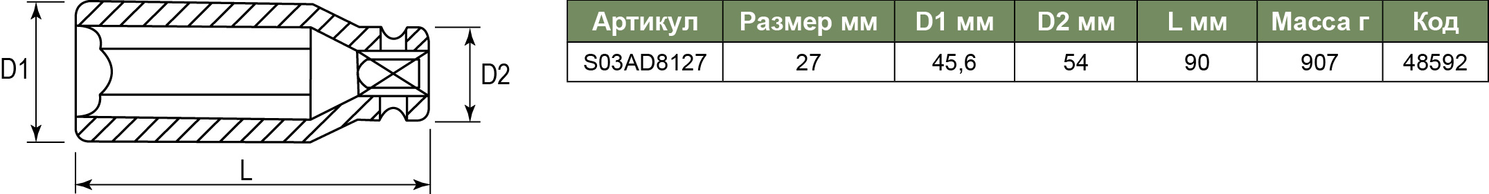 S03AD8127 Головка торцевая ударная глубокая 1"DR, 27 мм, код товара: 48592, артикул: S03AD8127