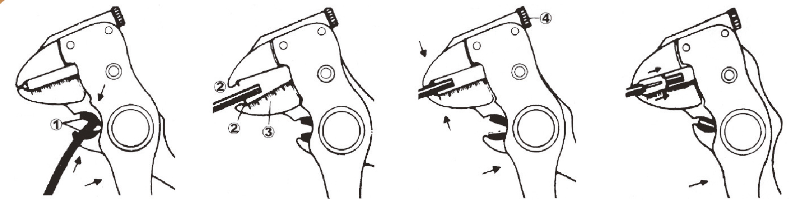 Полуавтоматический инструмент, сочетающий в своей конструкции резак для проводов и устройство для снятия изоляции за одно движе ние оператора. Необходимую длину срезаемой изоляции можно определить по линейке, расположенной на губке инструмента.