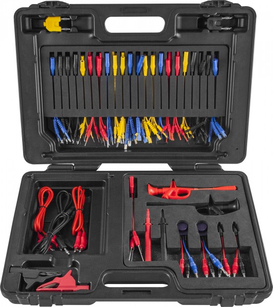 Универсальный набор применяется для контроля работоспособности элементов низковольтных систем электрооборудования автомобильной и автотракторной техники. Комплект содержит: переменное сопротивление (5КΩ), светодиодный тестер полярности, разъем для установки и проверки SRS (датчика подушки безопасности), зажимы «крокодил», набор игольчатых щупов, разветвитель 1х2, коннекторы с игольчатыми зажимами и набор клемных коннекторов, для круглых и плоских клемм различных производителей.