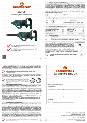 На пневматический механизированный инструмент торговой марки JONNESWAY® распространяется понятие «ограниченной гарантии», в связи с сокращением срока эксплуатации, связанным с повышенным износом некоторых деталей конструкции при использовании. Срок эксплуатации изделия с заявленными характеристиками определен в 12 месяцев с начала использования инструмента. Начало эксплуатации определяется по дате продажи, указанной в гарантийном талоне JONNESWAY® или фискальном документе, подтверждающем факт приобретения конкретного изделия. Срок применения инструмента с объявленными характеристиками может быть изменен индивидуально, как в сторону уменьшения, так и в сторону увеличения в зависимости от интенсивности и условий эксплуатации конкретного изделия (группы изделий).
