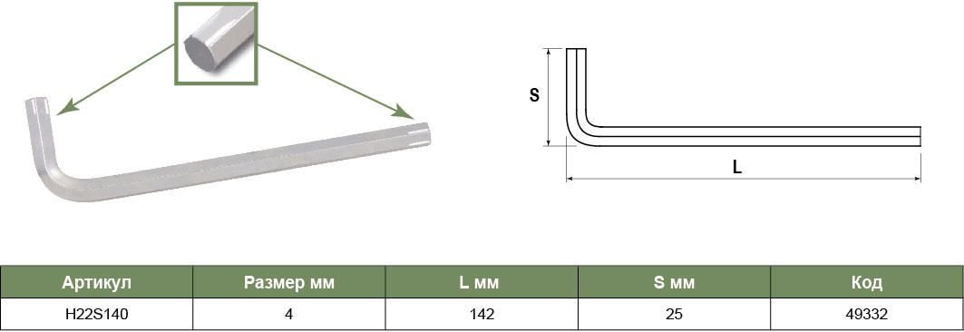 Серия специальных укороченных угловых шестигранных ключей "H22S", изготовлена из стали S2 и применяется для обслуживания резьбовых крепежных деталей с внутренним шестигранным рабочим профилем, в том числе, изношенным до 30%, за счет применения особой формы насечек на рабочих частях изделий.