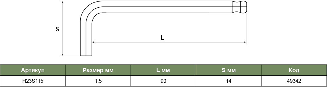 H23S115 Ключ торцевой шестигранный удлиненный с шаром для изношенного крепежа, H1.5, код товара: 49342, артикул: H23S115
