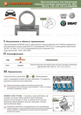 Приспособление AI040046 применяется для демонтажа катушек зажигания 8,12 цилиндровых (V8/V12) и 4-х цилиндровых двигателей VW B5 1.8 Turbo, GTI, FSI 2.0 автомобилей группы компаний VAG.