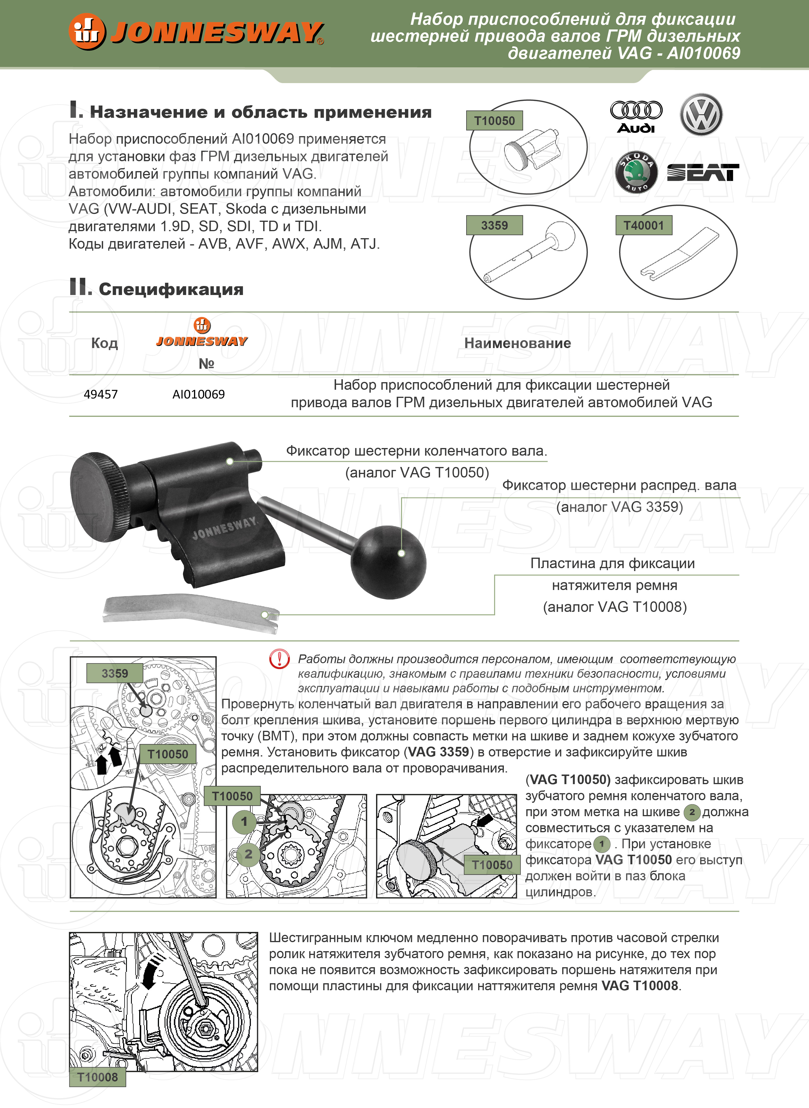 Набор приспособлений AI010069 применяется для установки фаз ГРМ дизельных двигателей автомобилей группы компаний VAG.