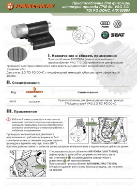 Инструменты и приспособления специального назначения производства компании JONNESWAY® ENTERPRISE CO., LTD., по уровню исполнения относятся к изделиям класса PROFESSIONAL, применяется для производства работ по сборке, ремонту и обслуживания продукции машиностроения, строго персоналом, имеющим соответствующую квалификацию, знакомым с правилами техники безопасности, условиями эксплуатации и навыками работы со специальным инструментом и приспособлениями.