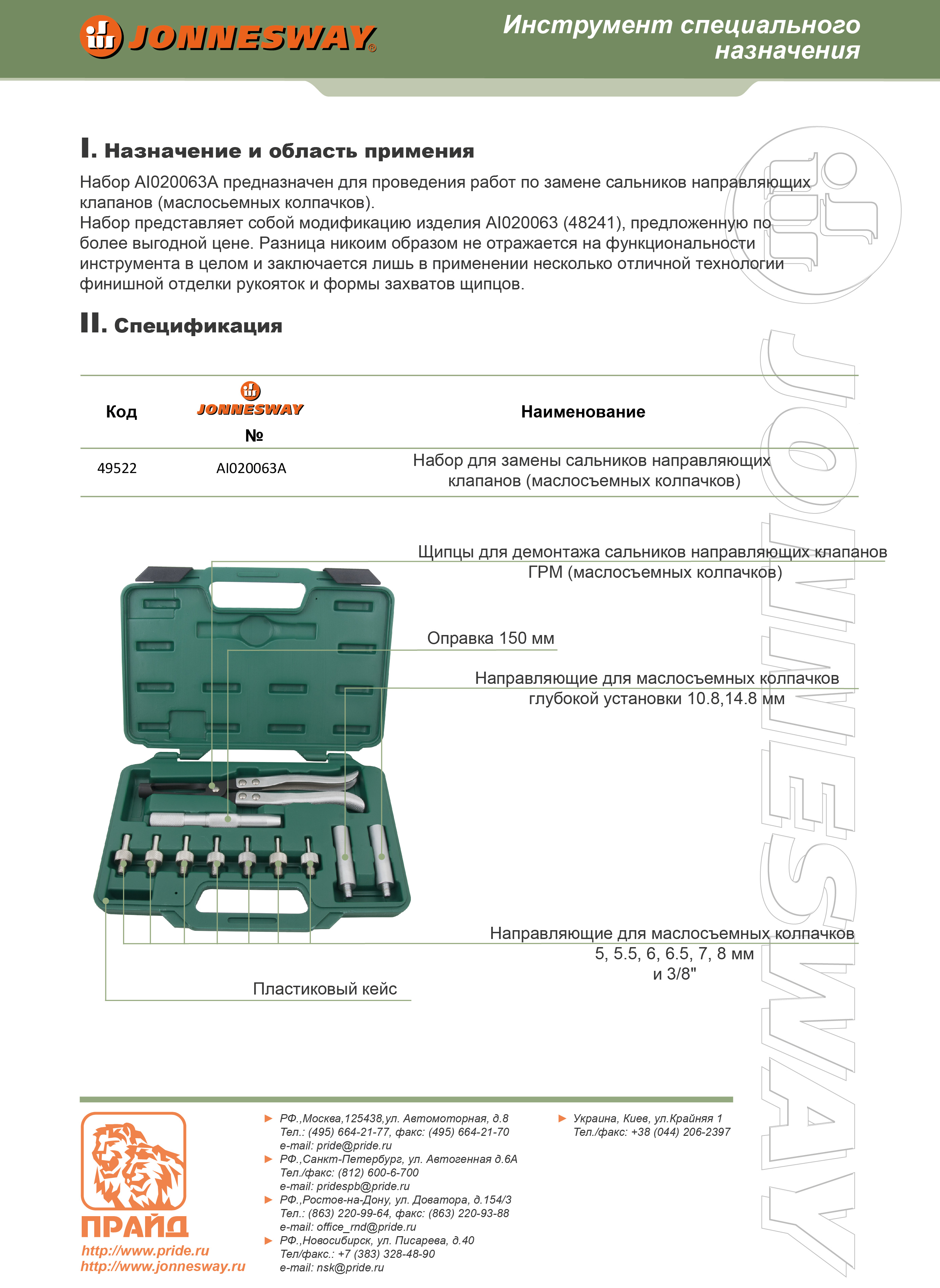 Набор AI020063А предназначен для проведения работ по замене сальников направляющих клапанов (маслосьемных колпачков).