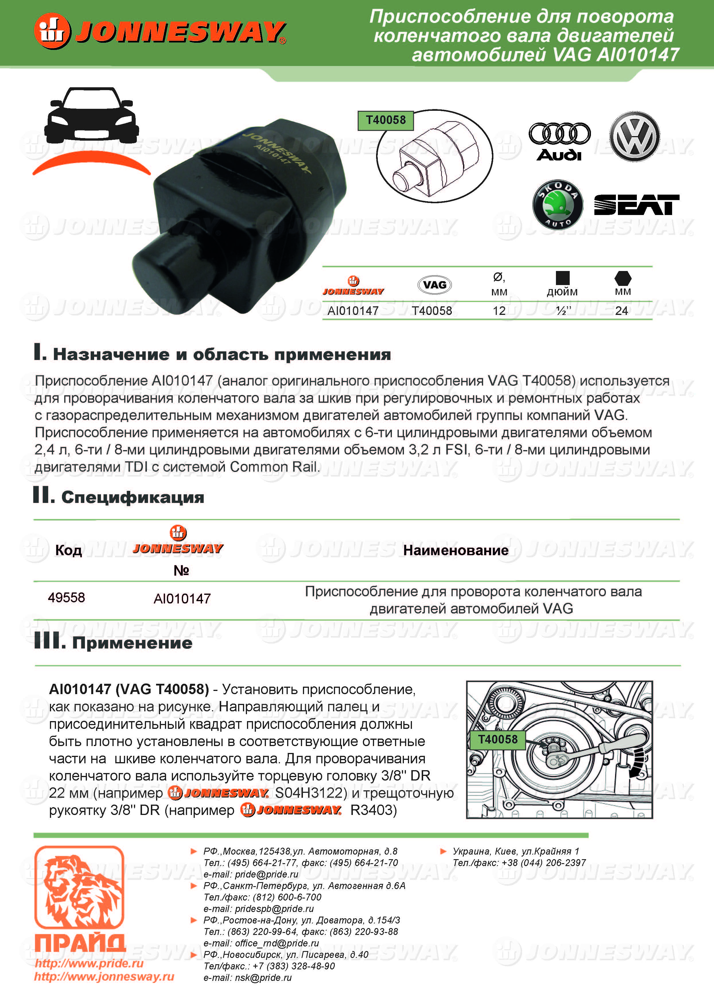 AI010147 Ключ для проворачивания коленчатого вала двигателей VAG. Оригинальный № VAG T40058, код товара: 49558, артикул: AI010147