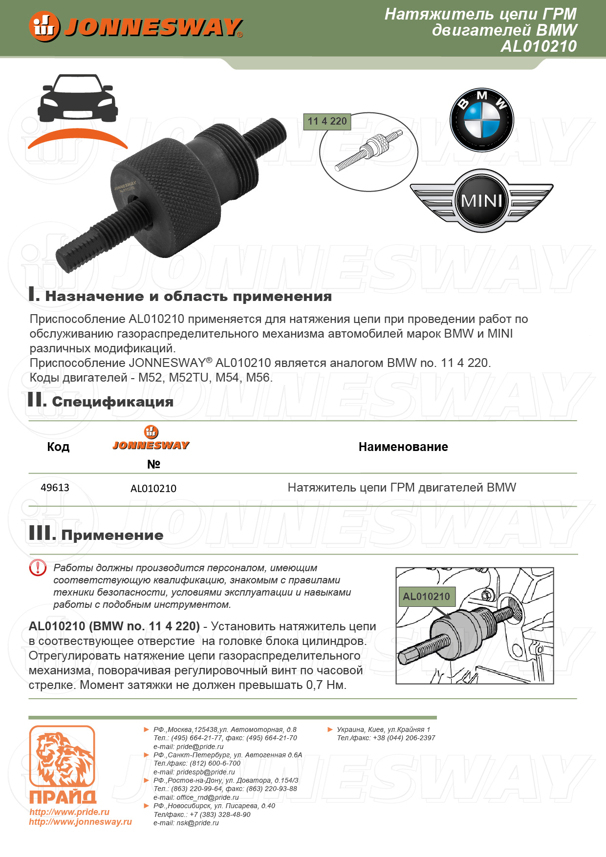 Инструменты и приспособления специального назначения производства компании JONNESWAY® ENTERPRISE CO., LTD., по уровню исполнения относятся к изделиям класса PROFESSIONAL, применяется для производства работ по сборке, ремонту и обслуживания продукции машиностроения, строго персоналом, имеющим соответствующую квалификацию, знакомым с правилами техники безопасности, условиями эксплуатации и навыками работы со специальным инструментом и приспособлениями.