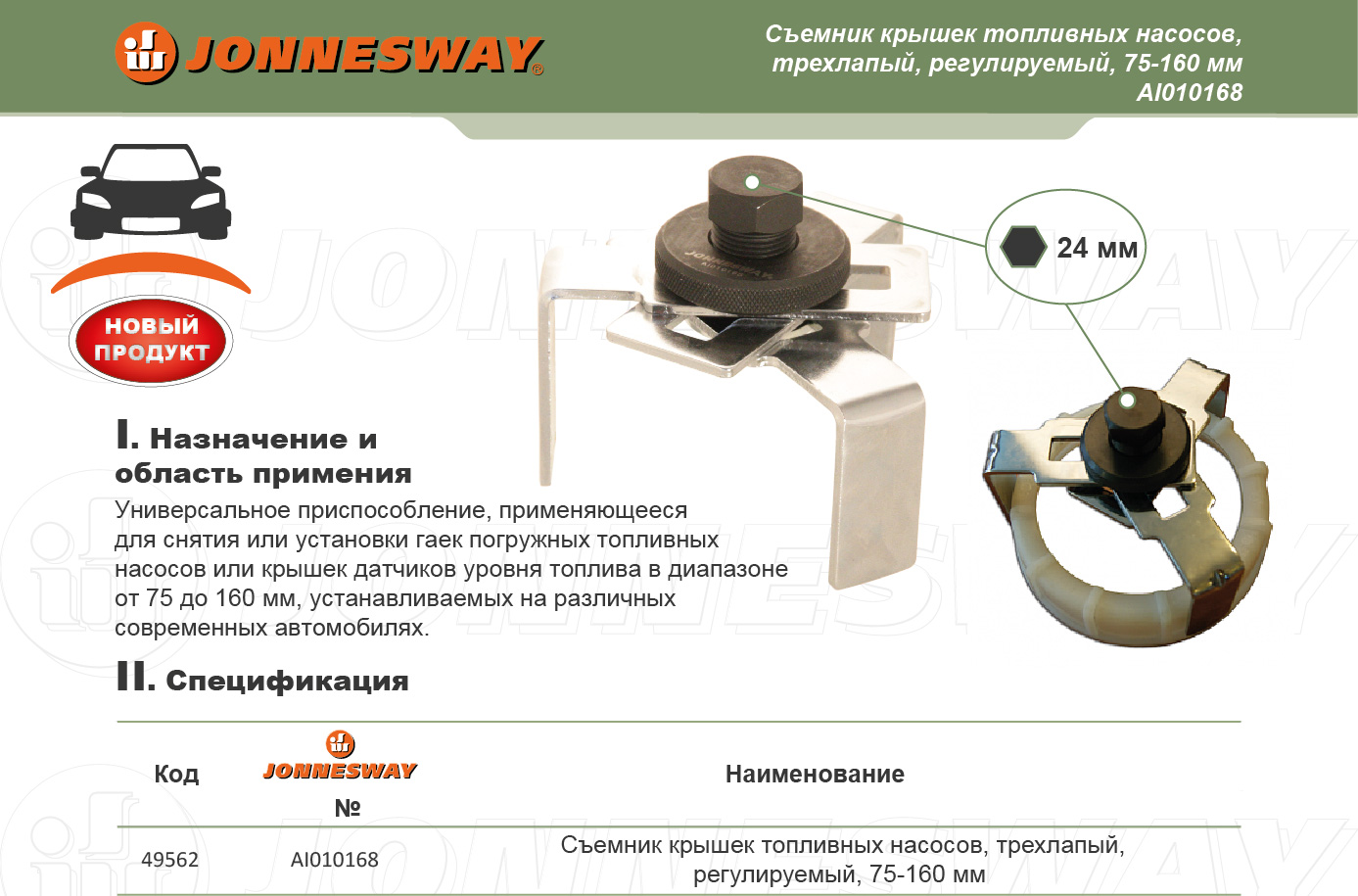 Универсальное приспособление, применяющееся для снятия или установки гаек погружных топливных насосов или крышек датчиков уровня топлива в диапазоне от 75 до 160 мм, устанавливаемых на различных современных автомобилях.