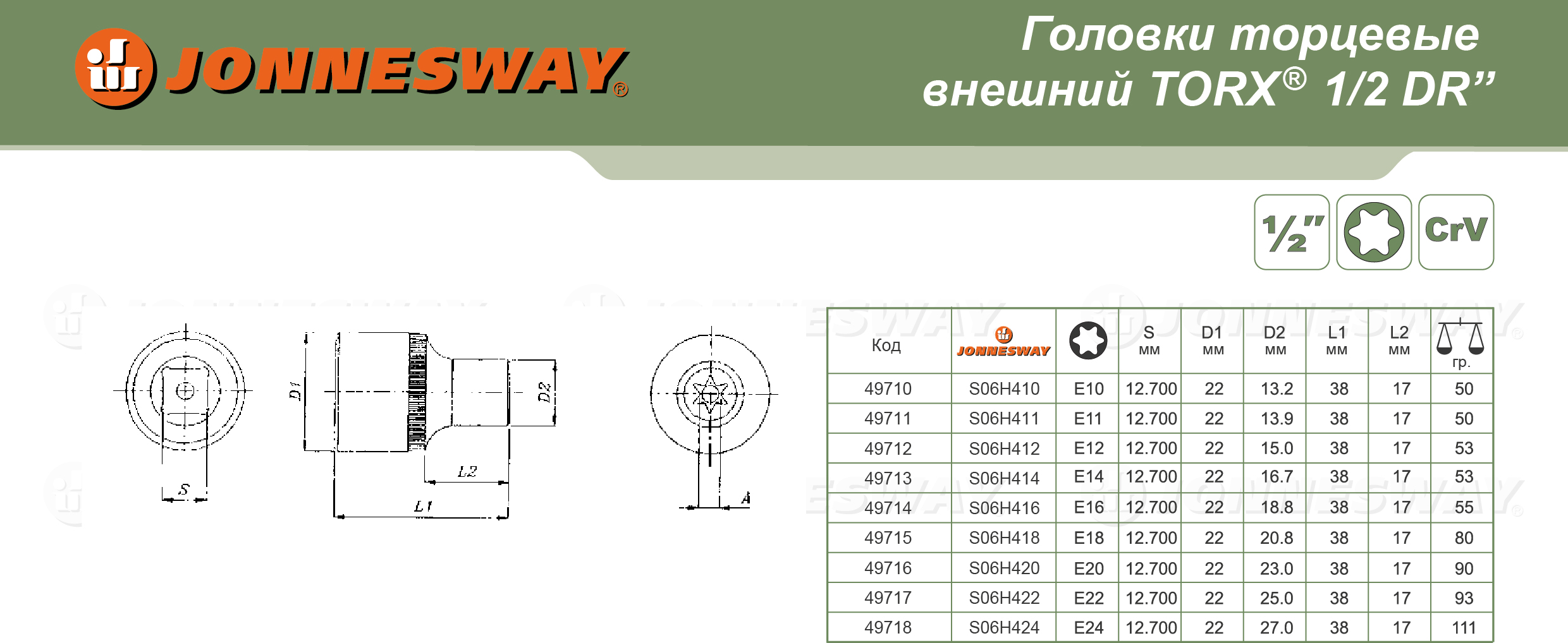 S06H411 Головка торцевая 1/2"DR, внешний TORX®, Е11, код товара: 49711, артикул: S06H411