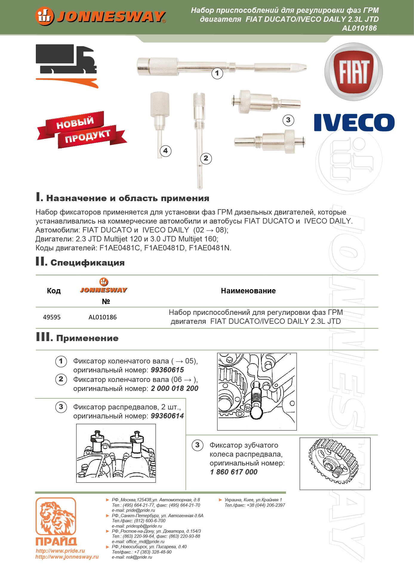 AL010186 Набор приспособлений для регулировки фаз ГРМ двигателя FIAT DUCATO/IVECO DAILY 2.3L JTD, код товара: 49595, артикул: AL010186