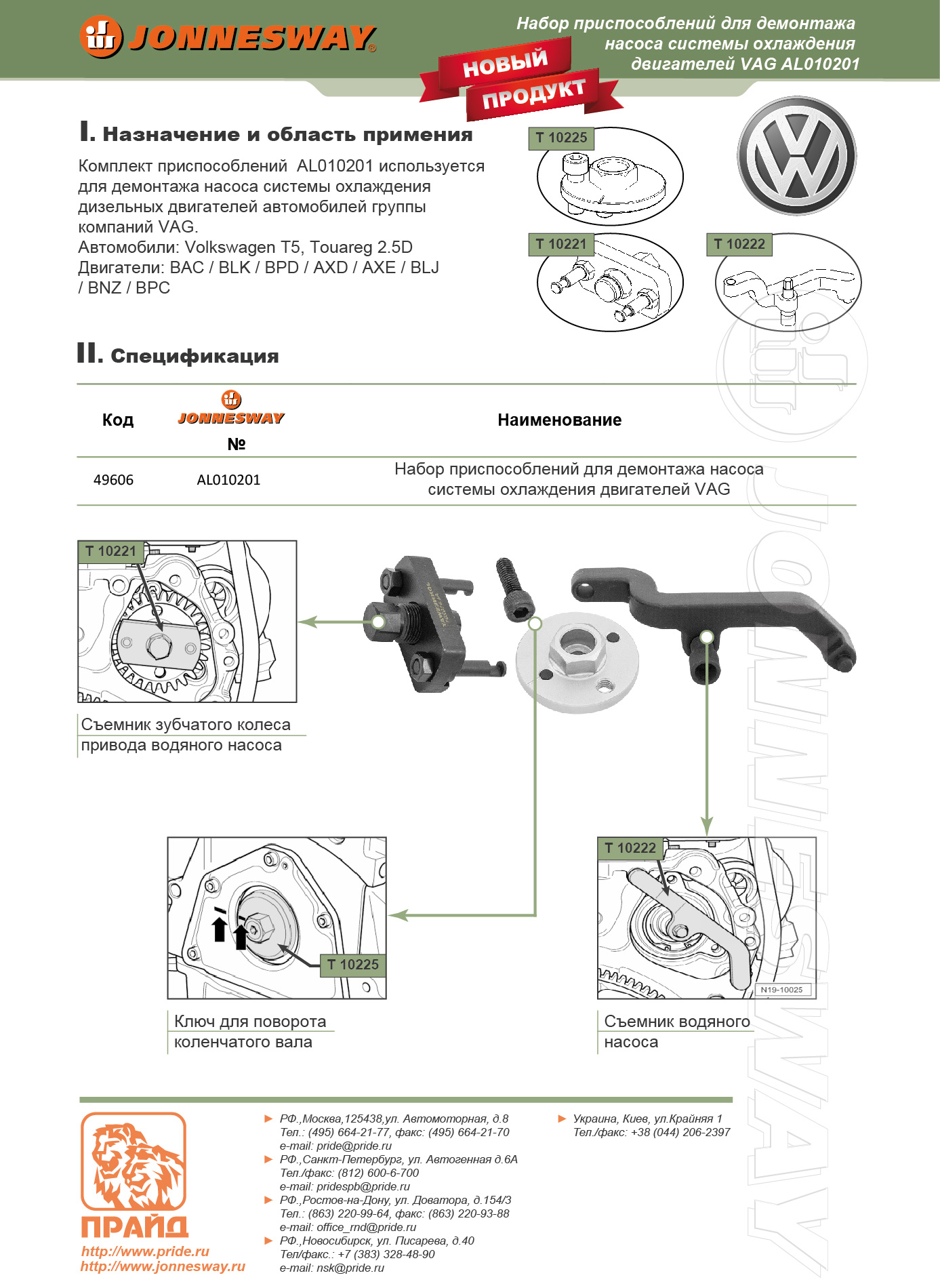 Инструменты и приспособления специального назначения производства компании JONNESWAY® ENTERPRISE CO., LTD., по уровню исполнения относятся к изделиям класса PROFESSIONAL, применяется для производства работ по сборке, ремонту и обслуживания продукции машиностроения, строго персоналом, имеющим соответствующую квалификацию, знакомым с правилами техники безопасности, условиями эксплуатации и навыками работы со специальным инструментом и приспособлениями.