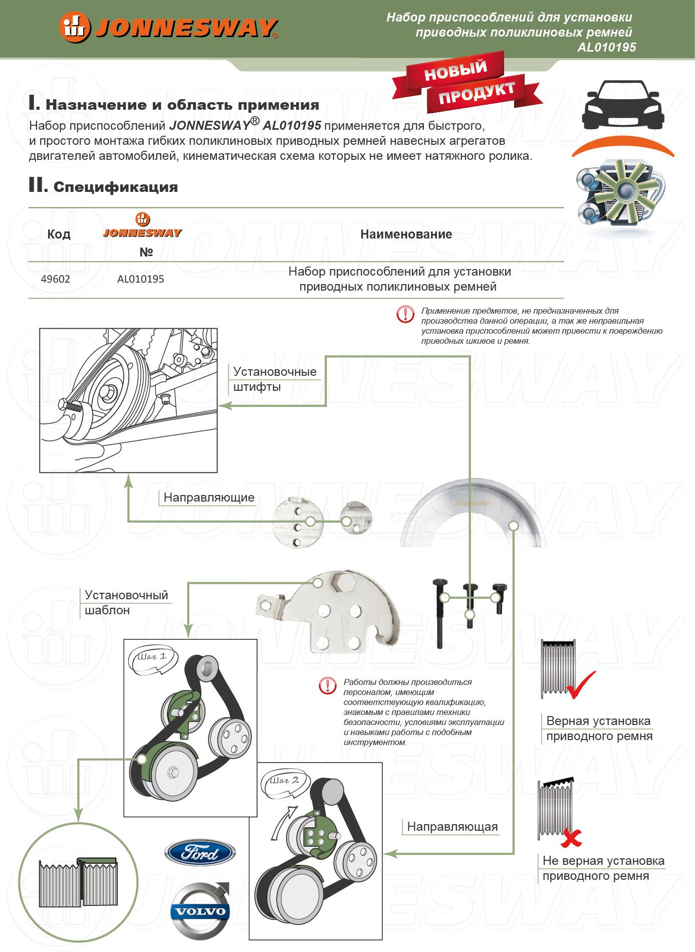 Набор приспособлений Jonnesway AL010195 применяется для быстрого, и простого монтажа гибких поликлиновых приводных ремней навесных агрегатов двигателей автомобилей, кинематическая схема которых не имеет натяжного ролика.