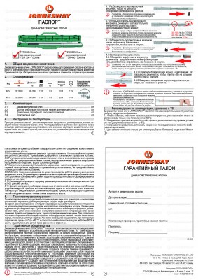 На предметы динамометрического инструмента JONNESWAY®, имеющие в своей конструкции кинематическую схему, распространяется понятие «ОГРАНИЧЕННАЯ ГАРАНТИЯ», что связано с повышенным износом деталей механизмов при использовании и изменения характеристик некоторых элементов конструкции в процессе эксплуатации. Срок поддержания гарантийных обязательств определен производителем в 12 месяцев с начала эксплуатации. Другими словами: подлежит замене или ремонту инструмент, имеющий дефект, обнаруженный или возникший в результате нарушений при его производстве и делающий невозможным использование изделия.