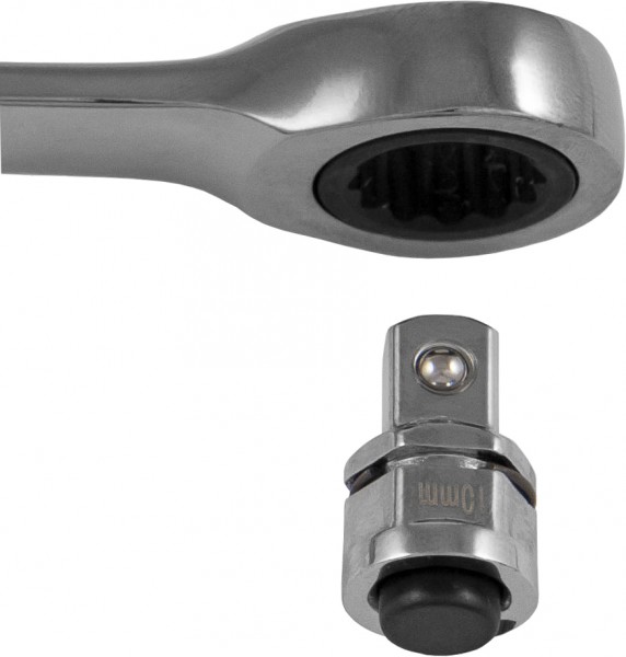 Привод-переходник для трещоточных ключей используется для присоединения к трещоточной части ключа торцевых головок - таким ключ трансформируется в трещоточную рукоятку. Изделие выполнено из легированной высококачественной стали и обеспечивает простоту и эффективность при работе.