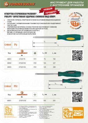 Инструменты для обслуживания внутренних рабочих профилей JONNESWAY® ENTERPRISECO., LTD., (отвертки стержневые и угловые и насадки являющиеся частью сборного слесарно-монтажного инструмента),по уровню исполнения относятся к изделиям класса PROFESSIONAL, применяются для производства работ по сборке, ремонту и обслуживания продукции машиностроения, персоналом, имеющим соответствующую квалификацию, знакомым с правилами техники безопасности, условиями эксплуатации и навыками работы.