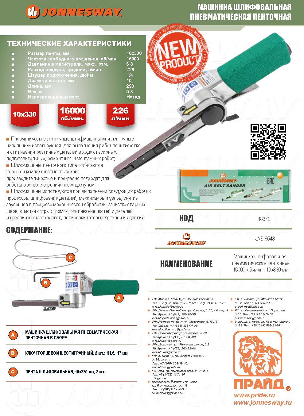 JAS-6543 Машинка шлифовальная пневматическая, ленточная, 16000 об./мин., 10х330 мм, код товара: 48379, артикул: JAS-6543